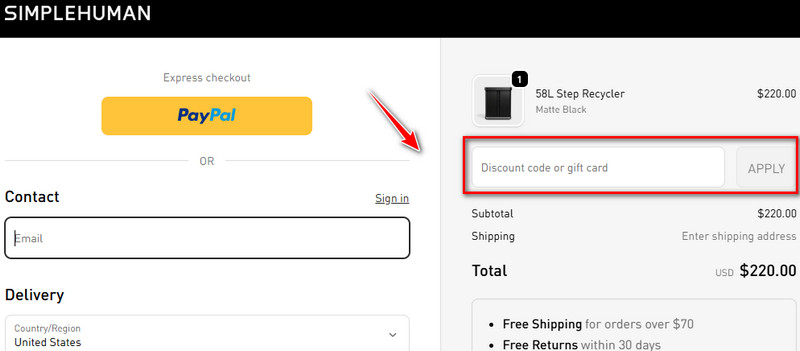 - Step 5: Paste your Simplehuman coupon code into the box and click “Apply”.