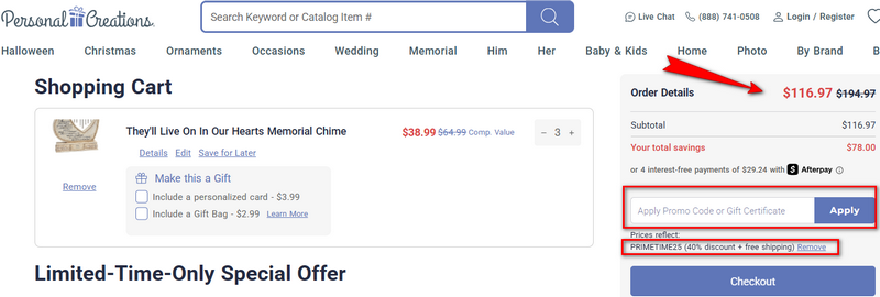Personal Creations 25% off plus free shipping coupons does not apply to any previous order, shipping, care, handling, or taxes, specially marked products, or bulk or corporate purchases of ten (10) units or more.