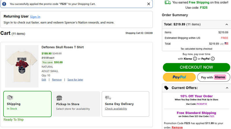 Spencer's free shipping offers almost always require a minimum purchase before discounts are applied. Common thresholds include $20, $25, or $60, depending on the active promotion (e.g., using code FS25 for free shipping on orders over $25). In-store pickup is the only method to avoid shipping costs on any size order.