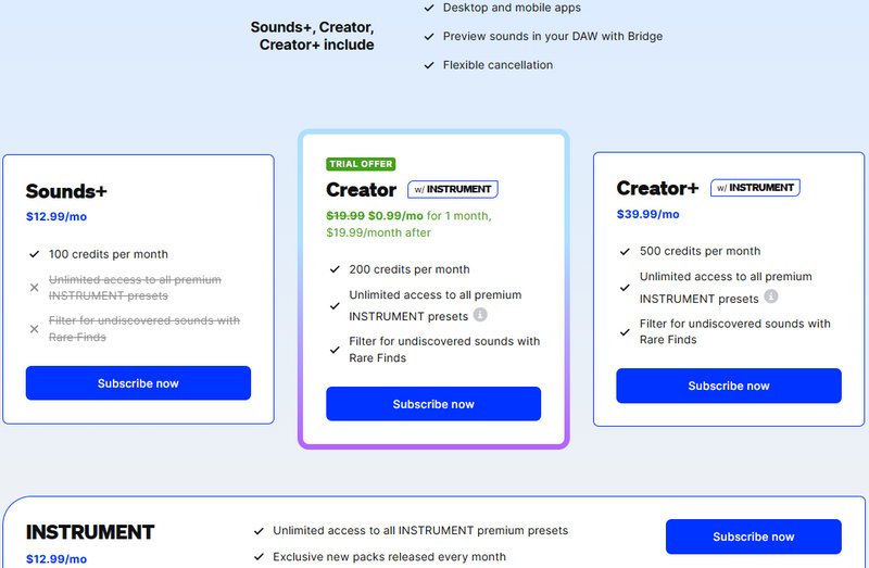 Expert Insight: If a project requires more than 80 samples or high-value 3-credit presets, the Creator Annual Promo is mathematically superior, offering a 60% saving per credit compared to the entry-level Sounds+ plan.