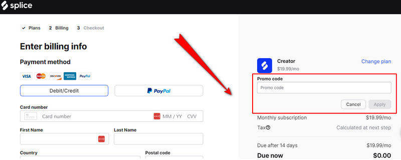The Splice checkout interface can be tricky because the promo field is often hidden until payment details are initialized. Follow these steps to ensure the discount sticks: