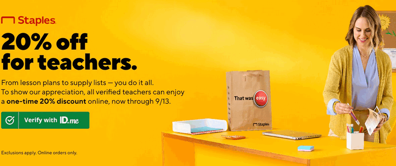 Teacher Discount | 20% off for verified educators (online & in-store) | Classroom supplies, printing services, stationery |