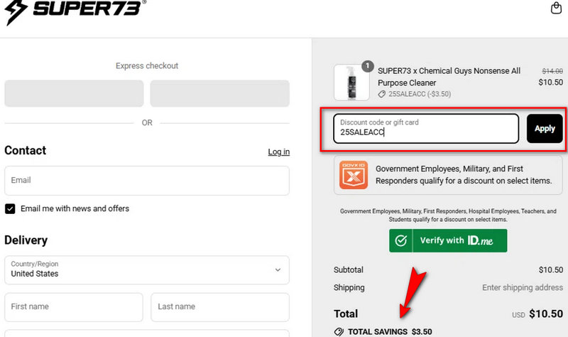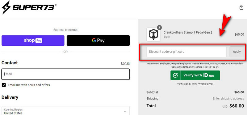 - Step 4: On the checkout page, you will see a field labeled "Discount code or gift card". Type your Super 73 coupon code into the field and click the "Apply" button to activate the code.
