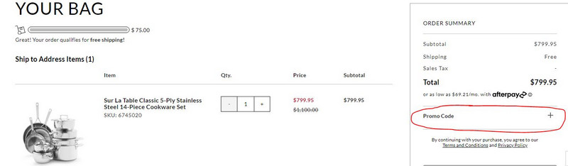 Sur La Table maintains an official discounts hub. Visitors can scroll to the footer of the website and select “Coupons” under the “About Sur La Table” section to view category sales, clearance items, and promotional events.
