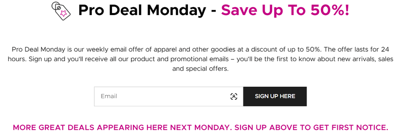 Pro Deal Monday is Terry Bicycles weekly email offer of apparel and other goodies at a discount of up to 50%. The Terry Bicycles coupon Pro Deal Monday lasts for 24 hours. Sign up and you'll receive all our products and Terry Bicycles coupons emails – you'll be the first to know about new arrivals, sale,s and special offers.