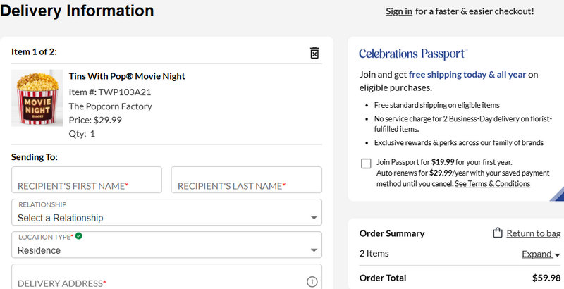 Celebrations Passport | Unlimited free shipping | Most orders across The Popcorn Factory & partner brands (e.g., 1-800-Flowers family) |