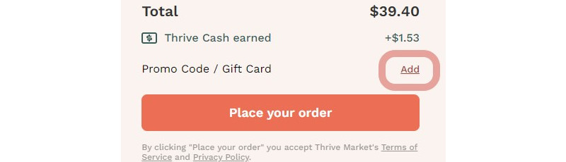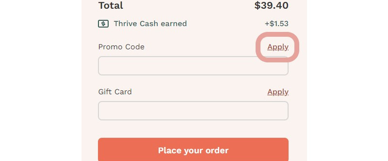 Direct promo codes for existing members are rare. Instead, look for "Thrive Cash" offers on the "Deals" page. Buying specific brands (e.g., 20% back on Chomps or Primal Kitchen) adds credit to your account for the next order.