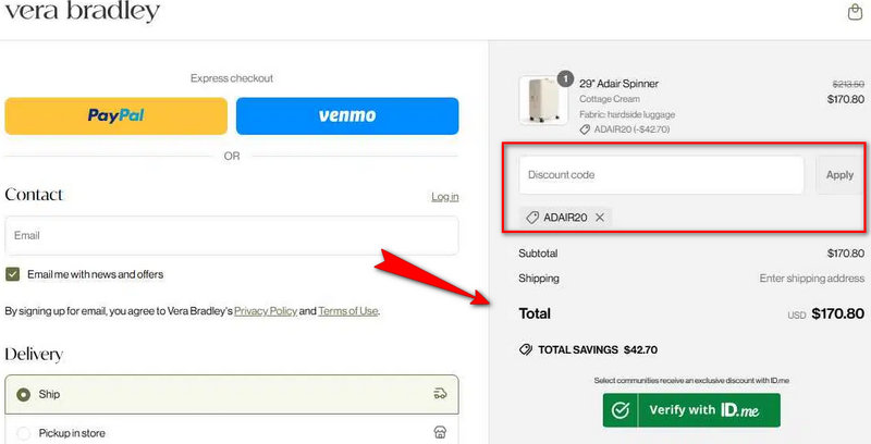 • Step 4: Apply and Redeem the coupon in checkout: At checkout, locate the promo or coupon field. Paste and apply the Vera Bradley code exactly as shown.