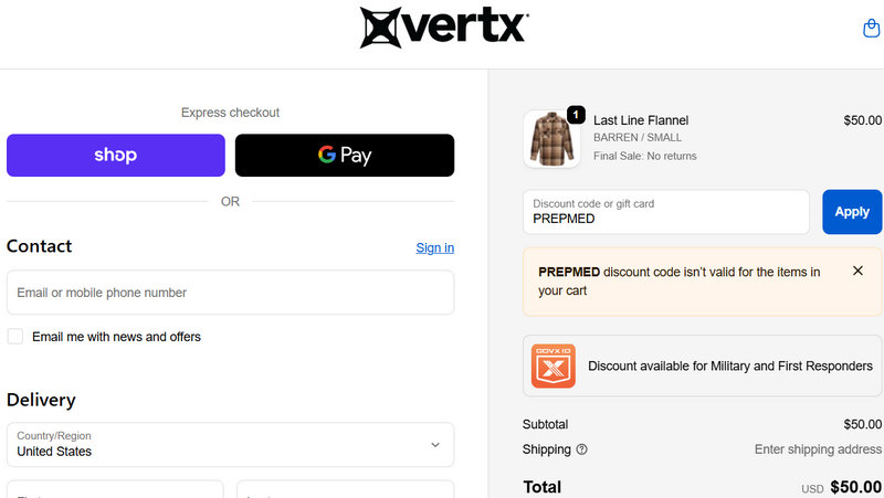 Region | Shipping address is outside the U.S., or the account is tied to a non-U.S. region. | Ensure the shipping address is within the U.S. and the Vertx U.S. site is being used. |