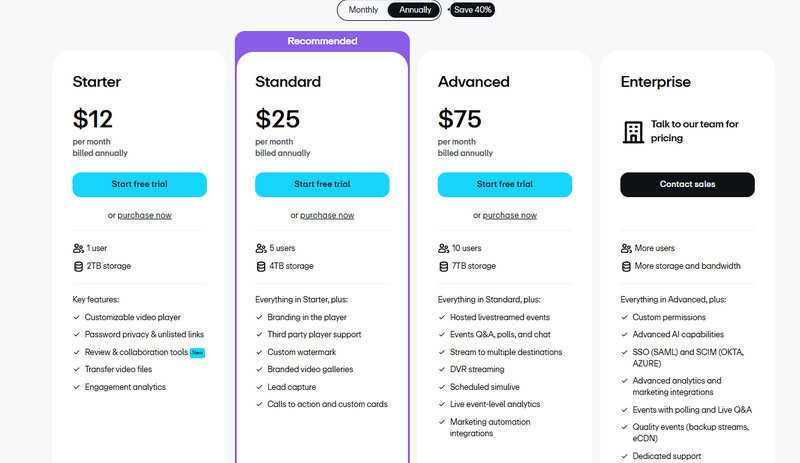 Vimeo is a professional video platform founded in 2004, known for creator-grade video hosting, privacy controls, ad-free playback, branded players, analytics, and marketing-friendly workflows. In 2026, its main self-serve plans are Free, Starter, Standard, and Advanced, with Enterprise available through sales, while older tiers like Vimeo Pro remain legacy for existing subscribers.