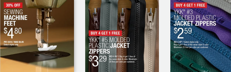 Daily Deals | 30% off sewing machine feet; Buy 4 Get 1 Free YKK® zippers | Machine feet, zippers, presser feet |
