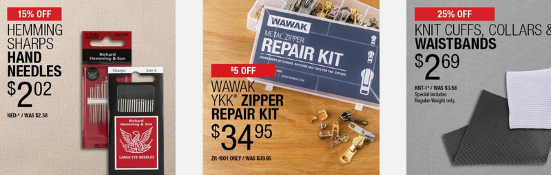 Clearance Sale | Up to 50% off + free shipping | Threads, zippers, notions, fabric care kits |