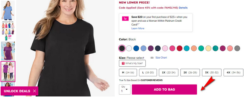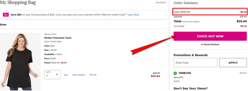 Generally, Woman Within allows only one promo code per order. If a free shipping code is applied, a second percentage-off code usually cannot be added. To maximize savings, compare the value of "Free Shipping" (up to $25 in savings for large orders) against a "40% Off" discount on a single item.